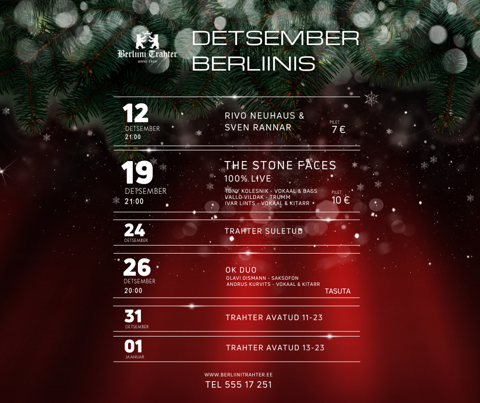 Berliini Trahteri Üritused detsember berliinis Korralda üritus, firmapidu või sünnipäev Otsite suurepärast kohta, kus mõnusalt õhtustada või soovite tähistada sündmust? Berliini Trahter on selleks ideaalne koht. grupimenüü Peolauad